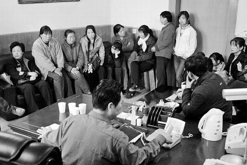 职工们围坐在马院长办公室讨要工资。记者 翟小雪 摄