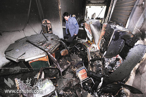该学生公寓位于武汉经济技术开发区碧湖新村。昨日上午9时,记者在该公寓42栋宿舍看到,该栋宿舍共有6层,其中1楼为临街门面。失火的游戏机室位于3单元201宿舍楼下,面积约50平方米,里面有10多台游戏机,均被烧毁(如图)。