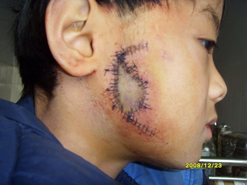 1月5日,记者在镇平县公疗医院看到,已住院17天的郑超群依然躺在病床上,他的父亲郑荣发在一边抹着眼泪。记者看到郑超群右脸上缝合上的脸皮呈葫芦型,面积有鸡蛋大小,伤口四周是密密麻麻的针线。