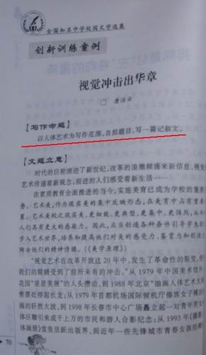 该书主编“唐治云”在引言部分提到,这是学校的一项“创新训练案例”,写作命题是“以人体艺术为写作范围,自拟题目,写一篇记叙文”,以“视觉冲击出华章”。