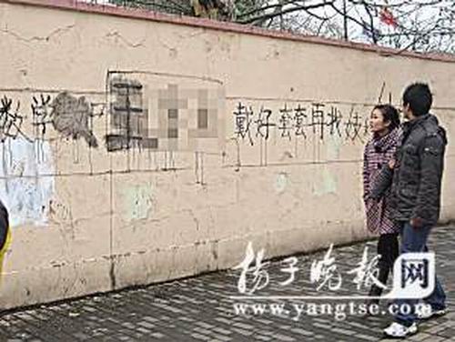 在大庭广众之下,被指名道姓书写在墙壁上辱骂,是否触犯法律?江苏圣典律师事务所的唐迎鸾律师认为,书写此标语的人,如果是捏造事实,散布这样贬损他人人格,破坏他人名誉的行为,触犯了刑法,可追究诽谤罪。鲍校长说,他们已经报过案,如果书写此标语的人确实是他们所推测的那位学生,学校会本着“治病救人”的态度,找到学生及其监护人谈话,希望该学生及时悔改;如果另有他人,学校和王老师会再进一步考虑追究其责任。(任国勇)