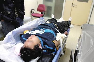 昨天下午5点,朝阳医院急诊大厅缝合室内,徐老师正在接受缝合手术。