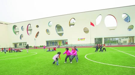 昨日下午,记者来到草堂小学翠微校区,4栋通过走廊连为一体的4~5层的建筑格外引人注目。正对学校大门的墙体,镶着10多个彩色的椭圆。设计者、西南交通大学教授王蔚介绍说,翠微校区占地20余亩,建筑面积一万余平方米,而总投资仅 2000多万元。“这些彩色的椭圆图案,代表着水滴。阳光下,‘水滴’呈现出不同颜色,这代表了学生们的不同个性。校舍以‘阳光下的水滴’为设计构思,充分表达了在我国素质教育的原则下,尊重个性发展,尊重少年儿童人格特征的理念。”