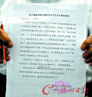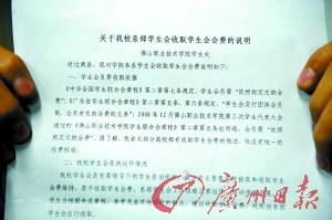 记者从该学校学生会2008年12月15日下发的一份盖有公章的《关于收取2008~2009学年学生会会费的通知》上看到,收取会费的根据是佛山职业技术学院第三次学生代表大会通过的《佛山职业技术学院学生会章程》(修改)中的有关内容,“凡取得佛山职业技术学院学籍的在校学生,均为本会会员”、“学生会经费来源,会员在校期间交纳学生会会费(每人每年20 元),由系学生会收缴,留用70%,上缴学院学生会30%。”