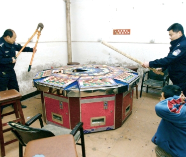 民警冲入赌博点时,10多名学生仍在大轮盘前酣战。现场,十余人一哄而散,一名男子从后门逃窜,另一名男子谎称如厕试图跳窗,被警方抓获。几名民警高举大锤和铁钳,使劲砸向轮盘机。20多分钟后,“大轮盘”才被砸碎。