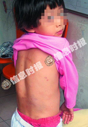 彩姐还拿出当天小晶晶被打后到医院照的照片。记者一看,不禁吓了一跳:小晶晶背部数处青紫,其中腰部位置的青紫有拳头大小,还有一些地方出现红色破皮擦伤。另外一张照片中,小晶晶的腿部数处出现条状青紫,看得让人心疼。彩姐说:“这些条状伤都是他们用网球拍打的,疼得孙女好几天晚上睡不着觉。”