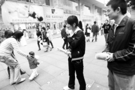40分钟后,9名学生来到观音桥。10时许,张玉琴鼓足勇气走向一家婚纱店,老板给了她一叠宣传册,“不管用何种方法,只要是能找够15名顾客来店咨询,就可得到30元钱。”这是这个团队第一个找到“工作”的人。
