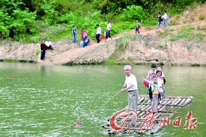 记者昨日在望楼村看到,地处村庄下游的高沙转水二级电站拦河坝蓄水让望楼村中央的河面扩宽至五六十米,从村中央通往三门坑的水泥桥只剩下几个桥墩孤零零地留在河面上。从望楼村去三门坑的渡口设在旧桥上游的100多米处,一个用七八根竹竿扎成的竹排用绳子拴在两岸,村民朱伯说,渡河只要站在竹排上两岸来回拉着绳索就可以了。