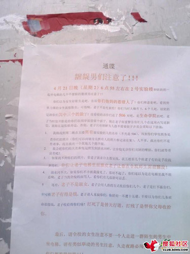前日,位于成都清水河附近的一所高校教学楼前,张贴出一张醒目的告示,上面写着“龌龊男们注意了”。告示上说,在本月21日傍晚6点55分左右,这位女学生在2号实验楼与几个男生一起乘电梯,被他们在电梯里戏弄,十分气愤,她记下了几个男生的脸和他们上课的教室。她要求几个男生在本周内写道歉信,且要贴在该告示的旁边。