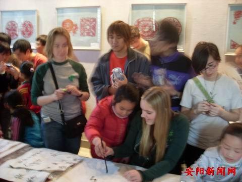 安阳市第一实验小学四年纪的50名小学生在老师带领下来到城隍庙参加书写甲骨文活动,来自美、英、加、奥等国的近百名外国留学生们前往安阳民间博物馆观赏民间艺术,安阳小学生与"洋同学"们手拉起了手,共同联欢,把一幅幅透着稚气、浸着古香的甲骨文作品,无偿赠送给那些“洋大学生”。