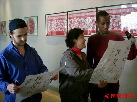 3月23日,近百名来自美、英、加、奥等国的外国留学生们前往安阳民间博物馆观赏民间艺术,中国甲骨文少儿辅导中心50余名安阳小学生将自己书写的甲骨文赠送给了这些异国的"洋同学"。