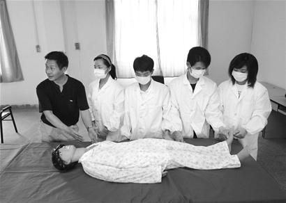 图为:武汉民政职业学院殡葬专业学生在老师指导下为遗体模型穿衣服。