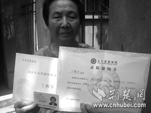 昨日(8月5日,下同)上午,家住汉口永清街赵家条的丁梅芳老太向记者展示了这封标称“北大资源学院(以下简称北资院)”,在8月3日寄达的录取通知书。记者看到,该录取通知书上写着:“丁梅芳同学,我校决定录取你入数字传媒学院系新闻传播(本)专业学习,请持本通知书于2008年8月25日……到校报到。”
