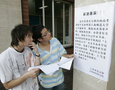 图片说明:师大录取通知书发现造假,两名学生正在了解告示相关内容。