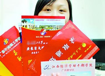 无独有偶,在城区跃龙路44幢居住的梁静波(化名),不久前竟然和50多岁的爸爸一起收到了来自江西某经济管理干部学院的“录取通知书”。“录取通知书”上的就读条件非常诱人,不但可以自选专业,还可实现专升本,而且百分百包分配,并保证学生在单位里能得到年终奖、出国深造、迁户口、安排家属就业等待遇。