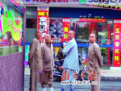 昨日上午10点30分,记者在丹灶街头采访时,巧遇一群“和尚”打扮的人,他们在丹灶城区商业大街的一些店铺或商场间穿梭,时而分头行动,时而又聚在一起,行色匆忙。