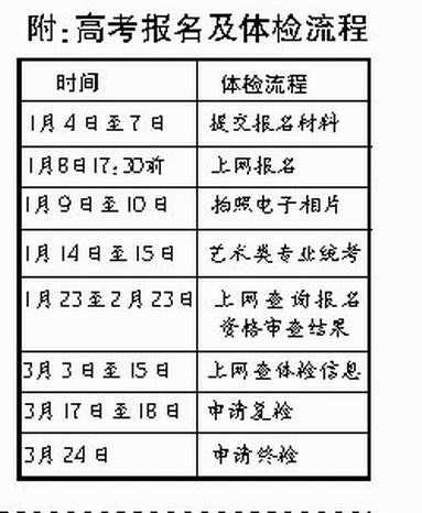 2008年高考报名时间为1月18日-23日,2009年高考报名时间为1月4日-8日。省考试局称,报名时间之所以提前,是因为今年春节来得早,教育部要求各省必须在春节前完成艺术专业统考工作。