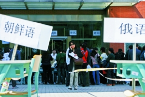 二外今年8个小语种专业计划招收102人,昨日报名现场吸引来2300余名家长和学生。现场,一位家长拿着计算器核算一番后,决定替孩子报考朝鲜语,“这个专业报考的人少,分数自然不会太高。”