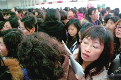 昨天(4日)上午9点,女大学生专场招聘会在北京市毕业生就业市场举办。此次招聘会共有50家企事业单位参加,600个岗位提供给前来应聘的女大学生。市人事局毕业生就业服务中心统计,截至下午2点招聘结束时,约5000人参加招聘,平均8人争取1个岗位。