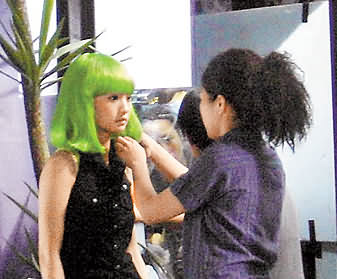杨丞琳(左)片中顶着一头萤光绿色假发,拍戏前工作人员帮她固定。