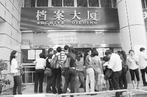 中国证券报记者在档案大厦四楼业务大厅看到,一间100平方米左右的房间开设了7个服务窗口,每个窗口前都挤满了人。而在档案大厦外面,没能排到号的市民迟迟不愿离去,任凭保安反复解释,人群仍是相当激动。