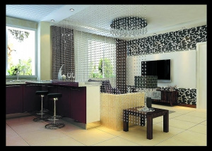 此方案为一居室户型,该户型的居住人群多为年轻人,因此方案为现代简约风格。将厨房完全敞开,与客厅连在一起,采用岛台的餐桌既节省空间,又时尚大方,使用水晶帘将沙发与厨房隔开,具有通透性。在颜色上采用米黄色的墙面,与黑白搭配的壁纸和红色烤漆橱柜结合,时尚感极强。(卢柳兆)