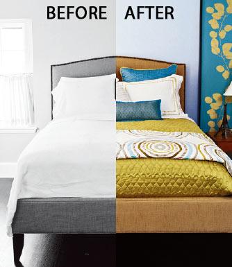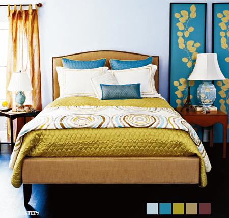 有很多种方式可以让卧室装饰进入高一级层次。在色彩上,增加明亮的对比色和立体图案,比如,增加一层被罩和一个柔软、可洗的被单,以金色饰边装饰来突出品位。