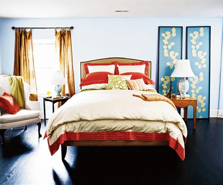 床罩始终是色彩配饰的基础,白色被褥与棕黄色的床形成互补,而海蓝色屏风与天蓝色墙面也协调地搭配在一起。