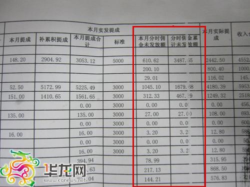 员工工资表上明确显示的“分时佣金”扣除情况 王森 摄
