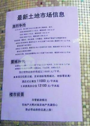 有意思的是,开发商临时贴出了一张“最新土地市场信息”的公告,先说了土地拍卖的“激烈争抢”和“震撼对比”两部分内容后,给出了“楼市前景”——“尽管新政频出,但地产大鳄对南京地产充满信心,势必带动房价迅速上涨!”一些购房人看到后忿忿不平:这不是明摆着和政府的调控政策“叫板”吗?开发商也太牛了吧!
