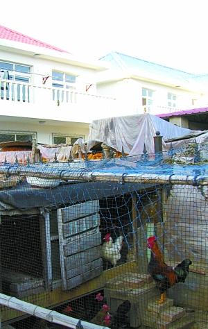 10月14日,河北永清县董家务村新民居楼内,有村民在院里饲养家禽。