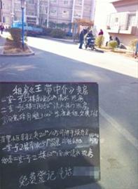 昨日上午10时30分许,记者还没走进玉带明苑小区大门,就看到一块写着“《玉带中介》租房、卖房”的黑板立在门柱上,黑板上密密麻麻地用白色粉笔标注着房子的类别与价格。