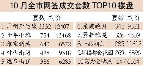 虽然广州于10月15日就出台了“限购令”,但由于绝大多数楼盘因为担心出现更多宏观调控政策以及避开亚运的影响,纷纷在9月底10月初抢闸推售,再加上很多业主为了赶“限购令”实施前的尾班车而急忙签约购房,最终导致10月广州十区两市的网签量甚至超过了9月份的12470套,创下17214套的新高。不过,由于10月份亚运城、广州雅居乐十年小雅、雅宝新城、时代南湾等郊区盘成交量较大,从而使得全市均价被略为拉低,录得11695元/m2,比9月份的12376元/m2下跌5.5%。预计在限购令等政策的影响下,再加上亚运转移了相当多买家的注意力,绝大多数开发商也不会再有明显的推货动作,相信11月的成交情况将处于价稳量跌的状态。 文/表:记者陈白帆