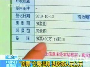 本报讯 据央视报道 浙江台州最近出现了一个新鲜事物“房票”。有许多楼盘须凭“票”才买得到,“房票”的价格便宜的要五六万元,最贵的要几十万元。记者昨天接到举报称,浙江台州一工商系统干部涉嫌倒卖“房票”。涉嫌买卖房票交易的人目前已经被停职,有关部门正在对此进行调查。
