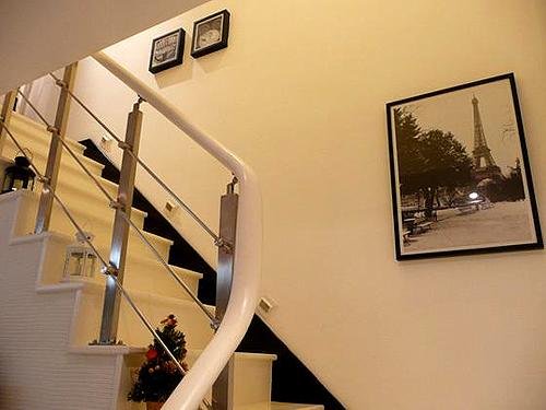 楼梯虽然朴实,不过效果不错而且经济实用,温暖的颜色驱赶了爬楼梯的疲惫。楼梯旁的地脚灯,效果不错但很少用到。