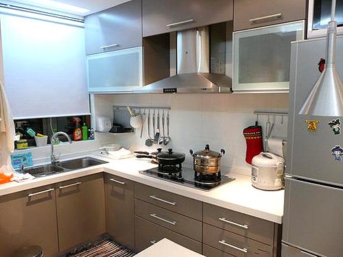 厨房,麻雀虽小,五脏俱全。橱柜喷漆的颜色是特意调的,与开放式客厅的中性色们很协调。