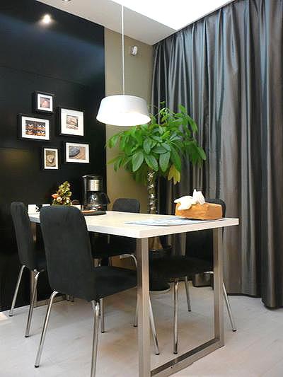 餐桌+黑色照片墙,其实餐桌的腿、椅子的腿,都很好看,在中性背景色中很适合。