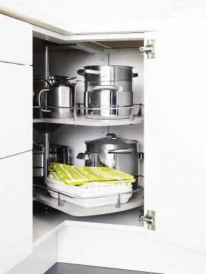 解决方案: 你可以尝试下拉出式/旋转式转角底柜,不仅可存放食物油、大米,还可存放大型炊具、沉重的碗碟和瓷器等,充分利用死角的同时方便拿取。