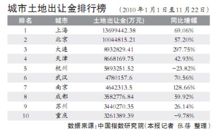 今年虽然遭遇史上最严厉的房地产调控,但各大城市的土地出让金却出现大幅提升。中国指数研究院的数据显示,截至11月22日,上海土地出让收入以1369.94亿元高居榜首,北京以1004.48亿元位列第二,大连以893.28亿元位居第三,去年排在第一位的杭州今年跌出前三,仅收入589.33亿元(详见附表)。值得注意的是,十大城市中,只有杭州和重庆的土地出让金出现了同比下降的现象,其余城市的出让金则大幅增加,增幅最大的是大连,比去年同期增长了297.75%,增幅最小的苏州也达到了26.14%。