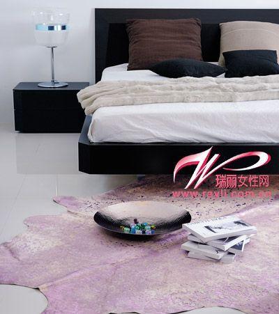 床尾地板处铺一块整张牛皮地毯,处理成粉紫色,可淡化卧室沉闷感,同时也让脚下变得更温暖。