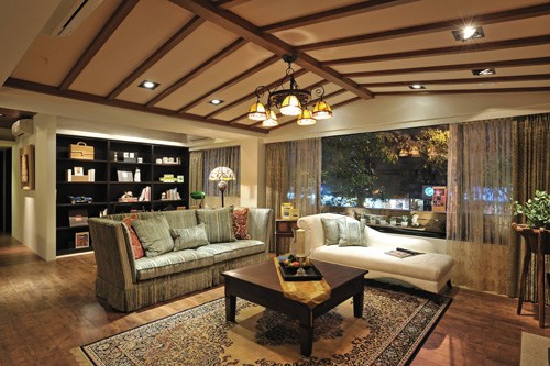 室内天花板利用柚木实木梁做出斜屋顶的感觉,屋内地板则使用实木地板,空间表情更显柔润。