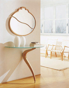 玄关处放置一个优雅简洁的镜台,既作为装饰,又可以放置花瓶、钥匙等,与居室装修风格协调,起到承上启下的作用。如果玄关空间较小,一般的设计思路是在侧对门的墙上安置玄关镜,加深视野以扩展空间。