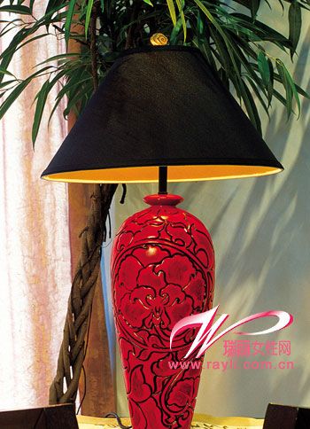 红色灯身配黑色灯罩的中式台灯。红色与黑色搭配,肃穆中添加了活泼,非常巧妙。
