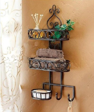 铁艺在田园风格的居室里常常运用,卫浴空间也可以利用上此物,空间飘散清爽的田园之味。这款铁艺收纳架造型奇特,自然花纹草滕的抽象组合,形成两个挂杆和若干的挂钩,能够挂上日常的用品。