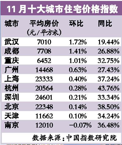 在北京、上海等十大重点城市中,除南京环比下跌0.07%外,其他9个城市房价平均高达15407元/平方米,环比上涨0.41%,同比飙升34.29%。