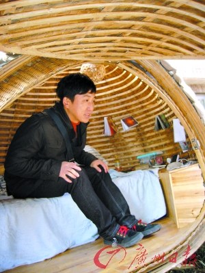 一位在北京工作的小伙子戴海飞,在自己工作的单位楼下,建造了一个“蛋形蜗居”,并于夜间居住于此。消息一传出,立刻引发了各方的高度关注。本报记者昨日一早前往探访这个位于北京市海淀区成府路附近的小“蜗居”,发现,它已出名了,不时有附近好奇的市民前来“猎奇”。“这小屋好是好,只是不知道能住多久,天气冷了,怎么取暖呢。”一位居住在附近的“猎奇者”对本报记者说。