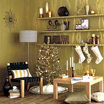搭配亮点:黄绿色的墙面,映衬着金色的线条,给人一种雍容华贵之感.一棵小圣诞树,几只圣诞袜,再配上方形小桌上的几个烛台,浓郁的圣诞气氛就被烘托出来了.再加上墙角的落地灯和黑色小椅,营造出儿童绚丽的圣诞之梦。