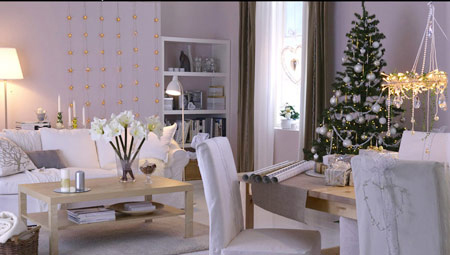 搭配亮点:素白的家具和墙壁正好与圣诞节皑皑白雪雪的世界相映衬,再加上旁边绿色的圣诞树点缀,使人不再意识到这是一个客厅,而是圣诞节中的唯美世界。