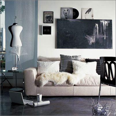 6.清澈白灰色的墙面,加之大块透明的玻璃窗,黑色的具有明亮反光的家具,桔红色的沙发,米灰色的地毯,室内充满了明丽的自然光。一切都显得清澈透明,淡雅宁静。茶几上放一盆花卉或果盘,使居室气氛更为清纯可爱。