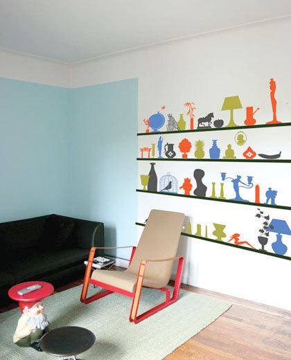 一款装饰隔物架的手绘墙贴,不仅可以节省空间,还可以给光秃秃的墙面带来色彩与美观。